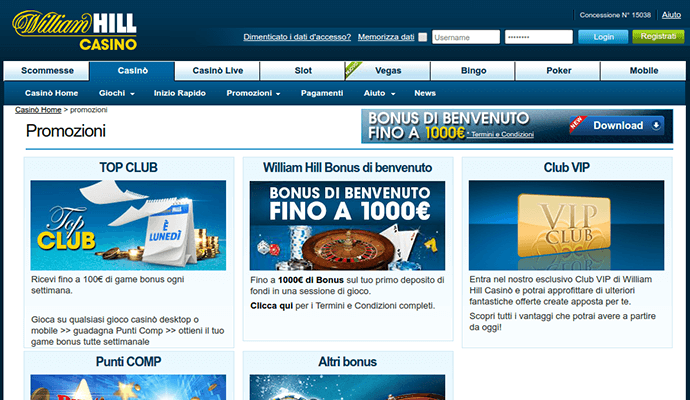William Hill è un casino tra o più solidi che opera sul territorio italiano proprietario della Playtech. Offre quindi prevalentemente giochi della società che controlla e ha recentemente aggiunto alcune slot della Netent, Ainsworth ed Igt. Il bonus di benvenuto sulle slot della Playtech è assegnato in base all’importo del primo deposito. Il 25% fino a 10 euro se si deposita da 10 a 39 euro, il 100% fino a 300 euro se il deposito è compreso tra 40 e 999 euro, il bonus massimo “highroller” del 100% fino a 1000 euro per depositi superiori a 1000 euro. La caratteristica migliore di questo bonus è il requisito di giocata che è di solo 20 volte, uno tra i più bassi per questo tipo di slot. Il supporto è tra i più qualificati e i pagamenti sicuri e veloci. Le promozioni purtroppo non sono frequentissime ed è questo l’unico punto debole di questo casino. Ma le qualità di base sono tutte presenti e quelle mancanti sono sicuramente migliorabili.