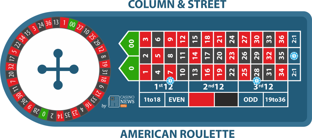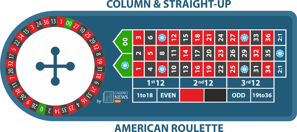 Per quanto riguarda la ruota della Roulette Americana, la più popolare combinazione di puntate contigue si basa sulla colonna centrale. L’ultima presenta l’intervallo (in senso orario) dai numeri 23 a 5 con cinque lacune (0, 7, 9, 28, 30). In aggiunta, altri due numeri rimangono fuori dell’intrvallo (8 e 29). Questa puntata copre un intervallo di 15 numeri, che rappresenta quasi il 2/5 del perimetro della ruota.
